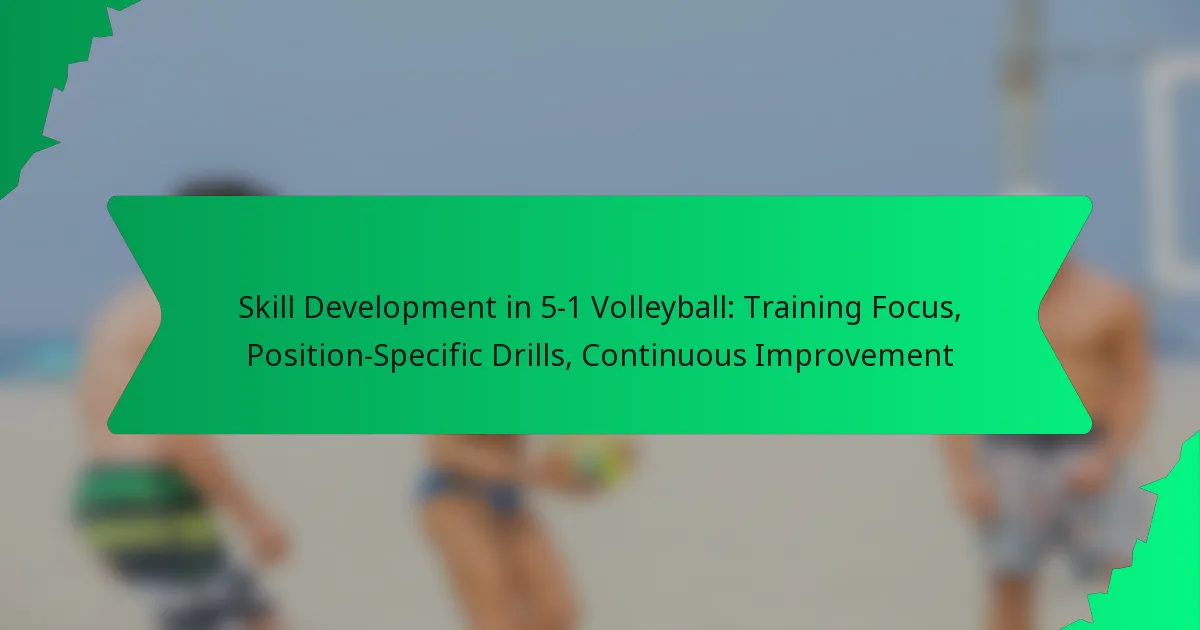 Players can enhance their skills in a 5-1 volleyball system by focusing on position-specific drills tailored to their roles. These drills not only refine individual techniques but also promote teamwork and game understanding, leading to continuous improvement on the court.